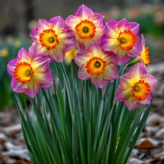 - Высота растения: Нарцисс Файер Вотекс обычно достигает высоты 35-45 см. Это делает его идеальным для выращивания на клумбах, в миксбордерах, а также в контейнерах на балконах и террасах. Прекрасно смотрится в групповых посадках, создавая эффект яркого ковра.
